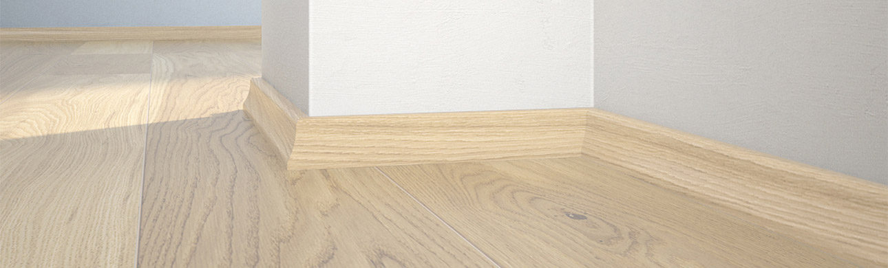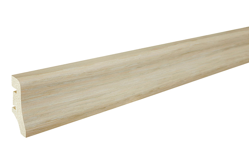 A fehérre lakkozott Tölgy szegélyléc válogatott lombos fából készült réteggel van befejezve, amely meghatározott színnel rendelkezik. Rendkívül tartós és méretstabil. Az elektromos vezetékek számára kialakított vájatok révén nagyon funkcionális, és emellett tiszta és elegáns megjelenést biztosít.