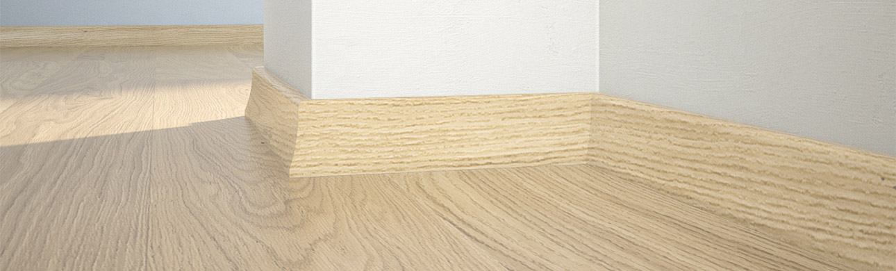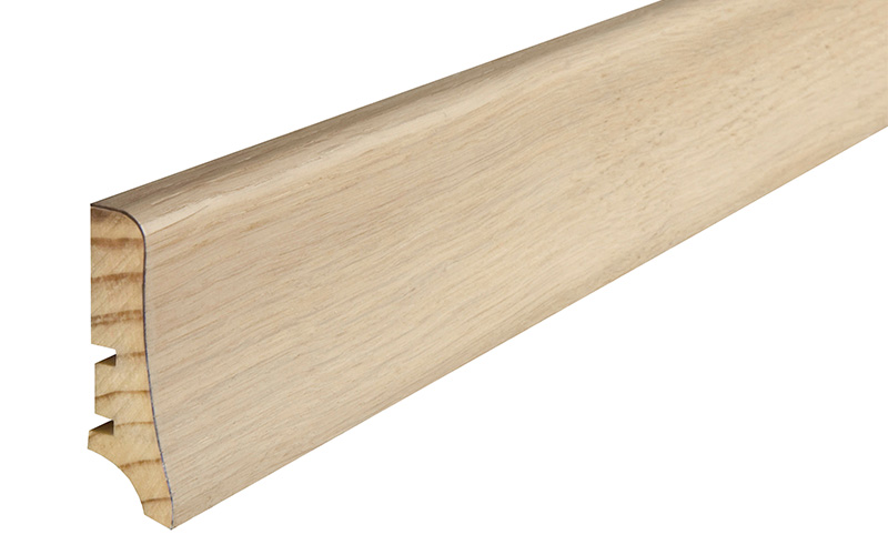 A fehérre lakkozott Tölgy szegélyléc válogatott lombos fából készült réteggel van befejezve, amely meghatározott színnel rendelkezik. Rendkívül tartós és méretstabil. Az elektromos vezetékek számára kialakított vájatok révén nagyon funkcionális, és emellett tiszta és elegáns megjelenést biztosít.