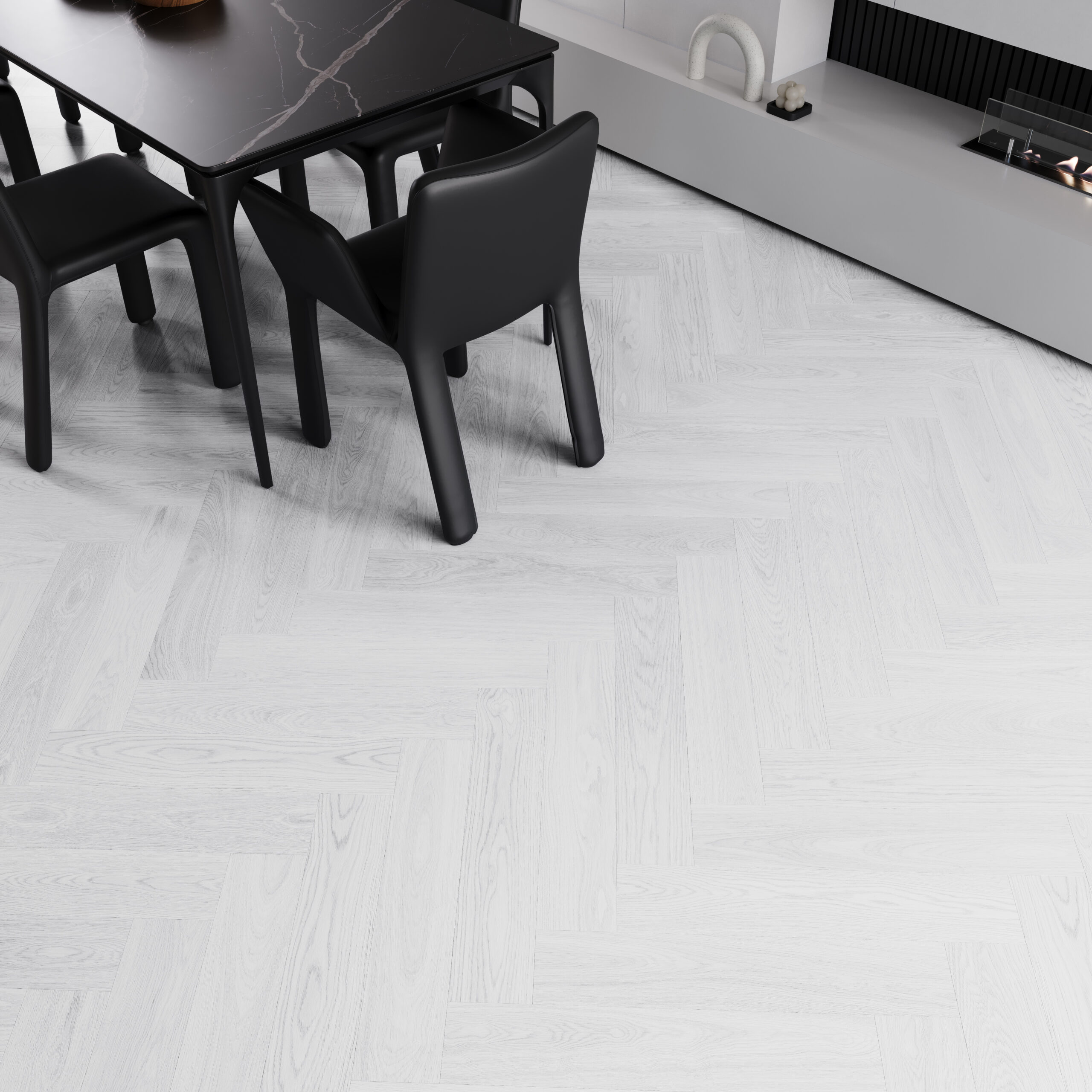 Frissesség és presztízs egyben. A hideg, világos tónus halszálka mintában modern jelleget és luxus minimalizmust kölcsönöz a térnek.