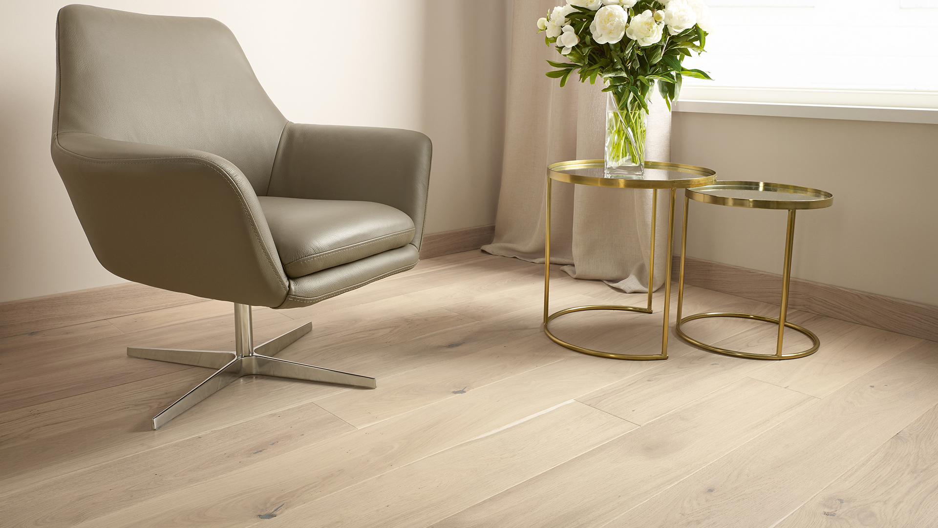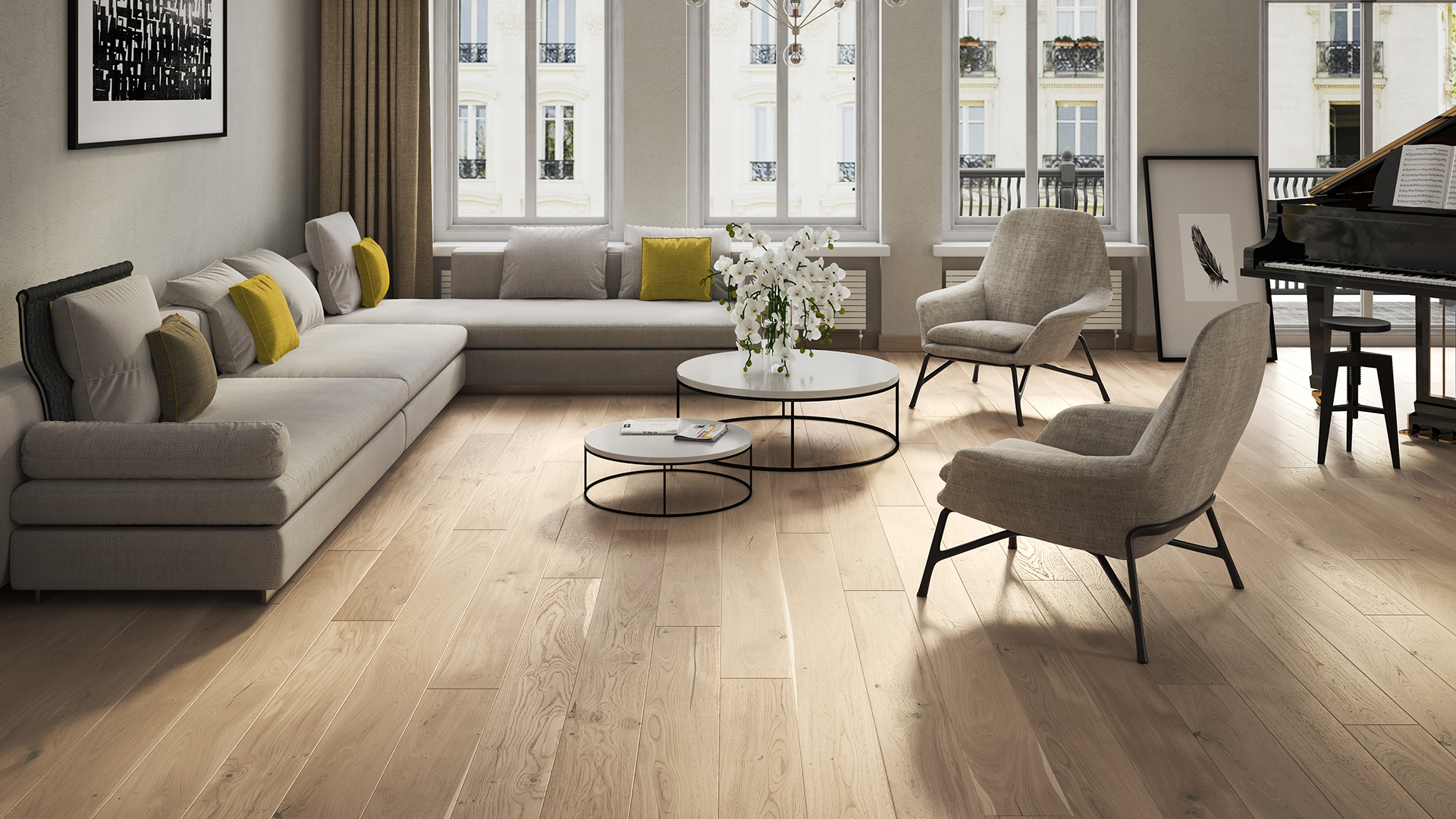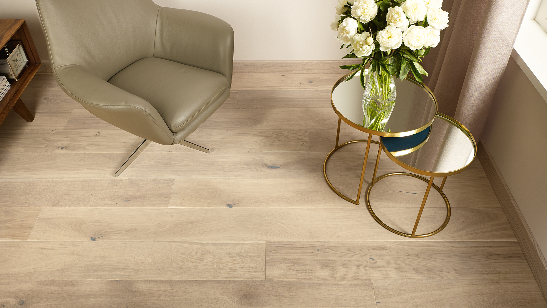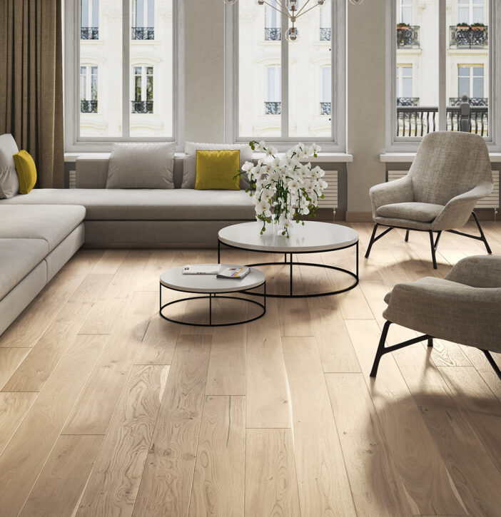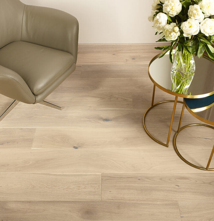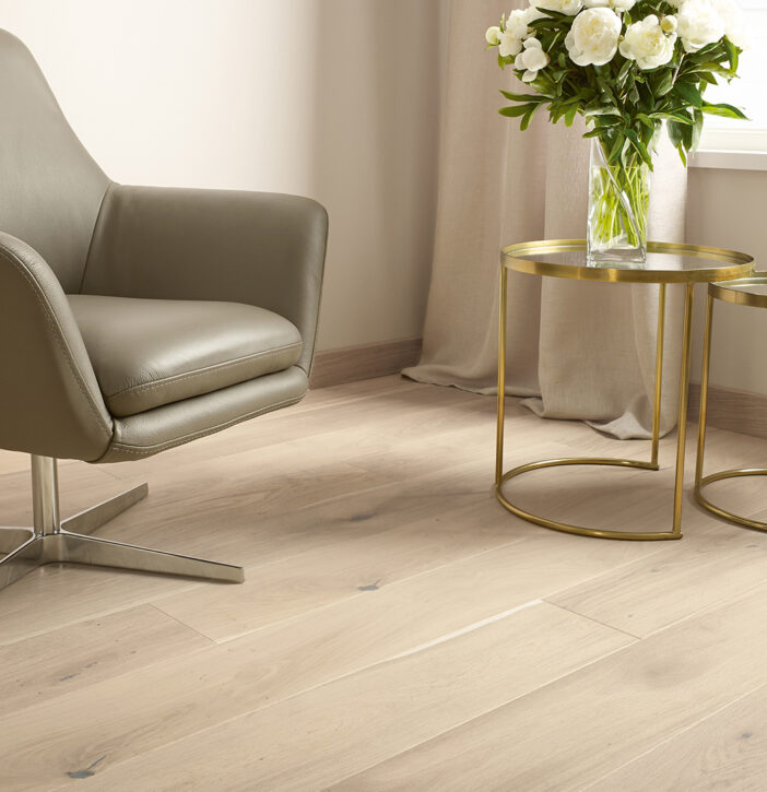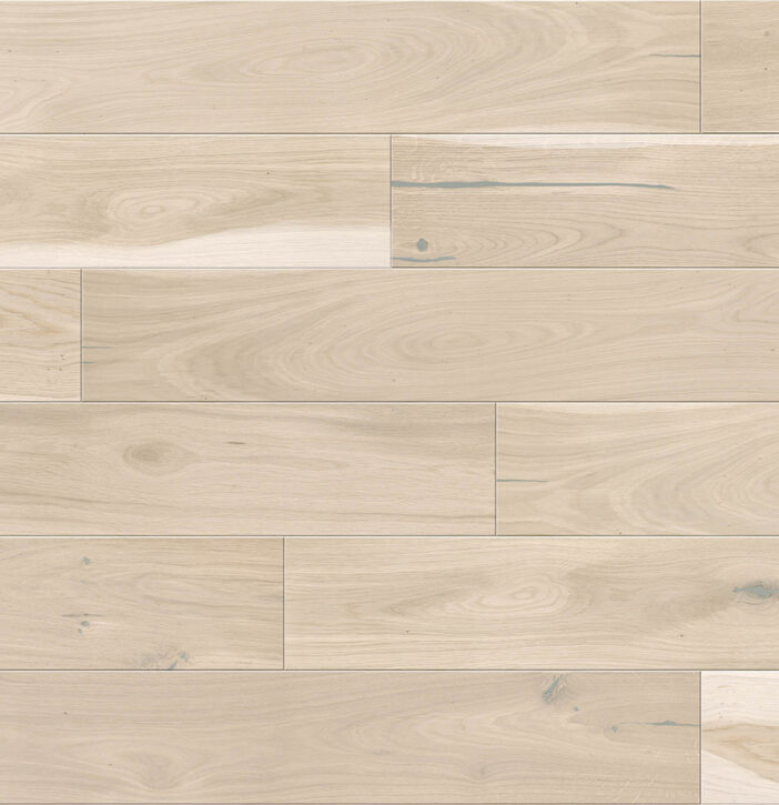 1-sávos padló erős tölgyfából, finoman visszafogott fehér színnel. A finom természetes vonásokat a csiszolási folyamat még jobban kiemeli. Természetes olajozású padlók, amelyeket négyoldali ferde bevágással hangsúlyoznak.