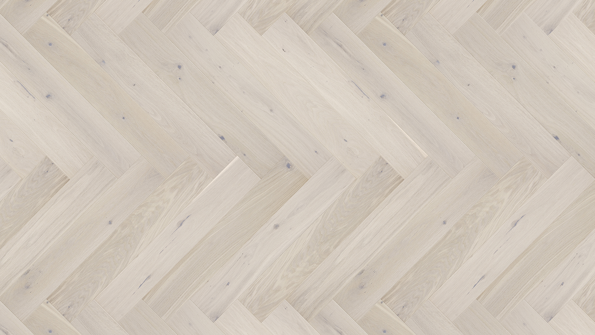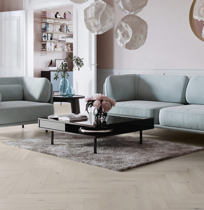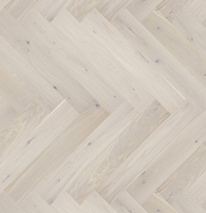 Tölgy padló gyöngyházfehér színben.  A padlók szálcsiszoltak, ami kiemeli a fa természetes erezetét, a négyoldalú mikro-bevágás pedig a karcsúságát és könnyedségét hangsúlyozza. A padlók finom matt lakkal vannak bevonva.