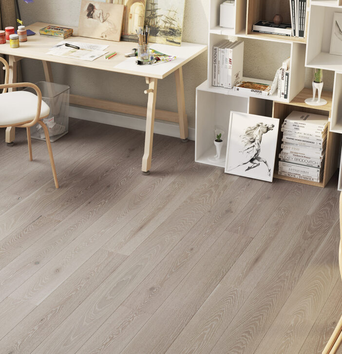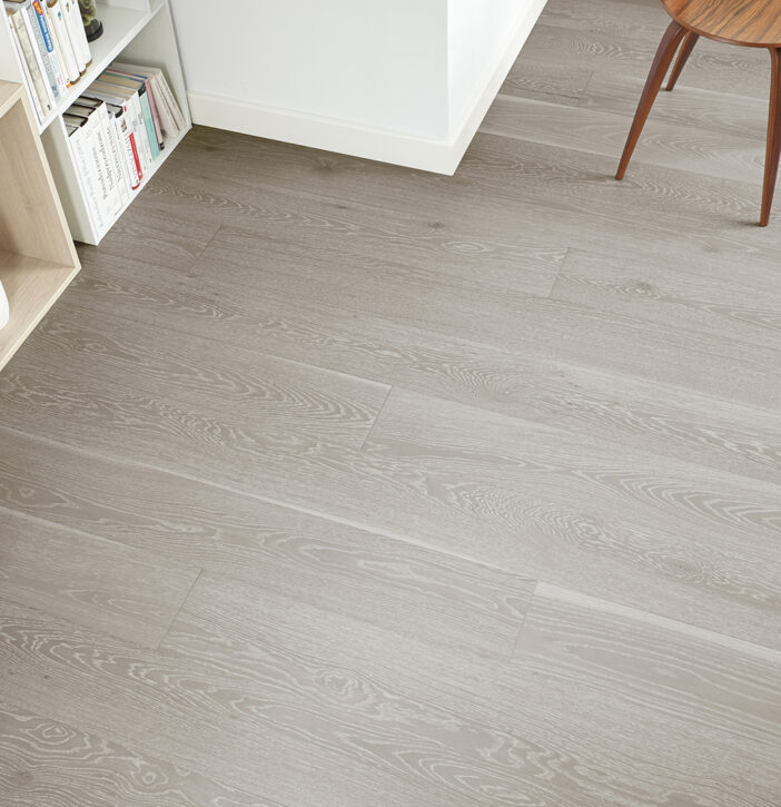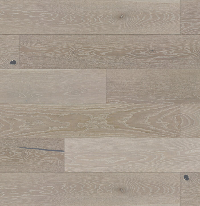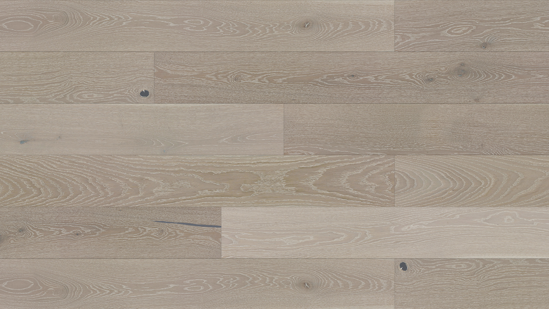 A modern dupla festés és a finom matt lakk jellegzetes duetté keveredik ebben a tölgyfa padlóban. A szigorú szürke árnyalatok modernista változata kontrasztban áll a fehér csiszolással, amely lágyító hangsúlyt ad. A 4 oldalas mikrobevágás karcsúsítja a táblákat.