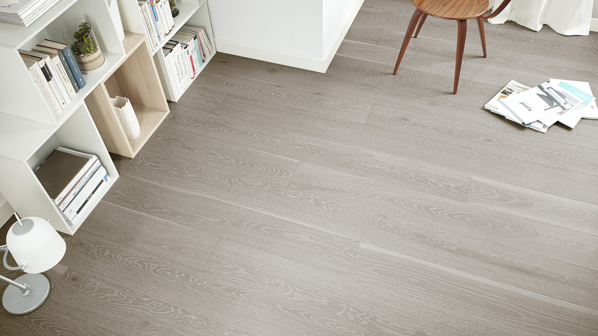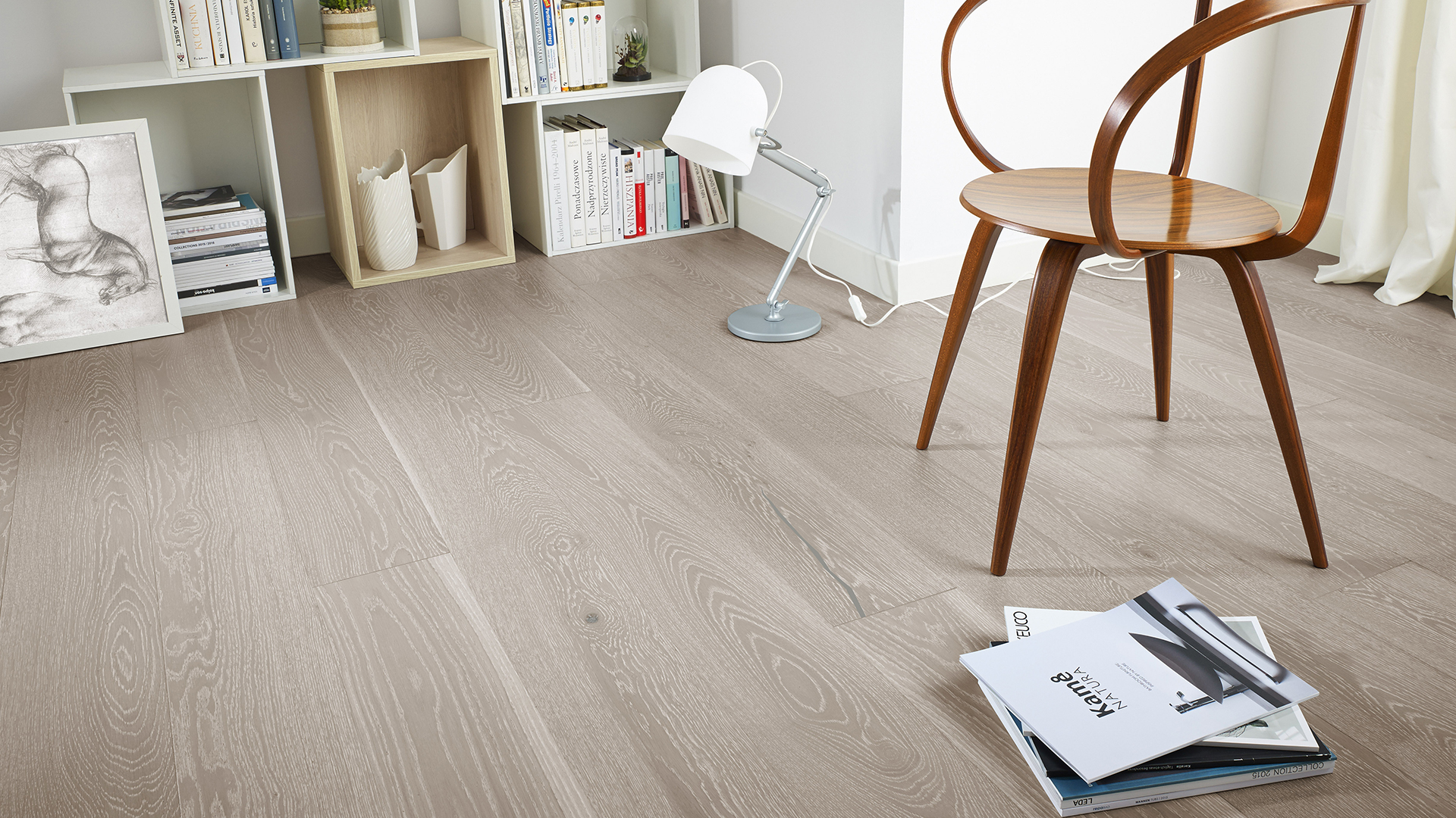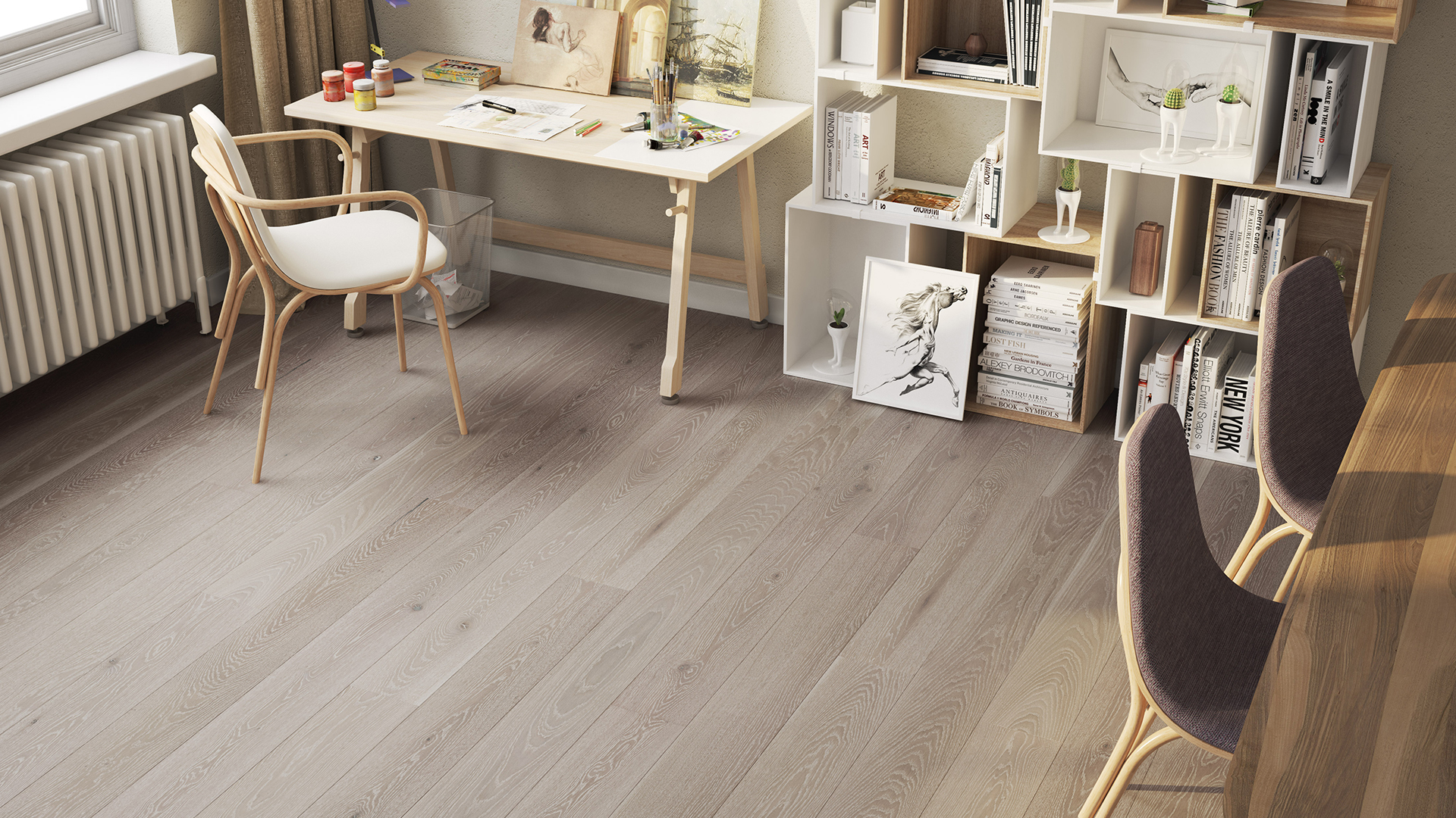 A modern dupla festés és a finom matt lakk jellegzetes duetté keveredik ebben a tölgyfa padlóban. A szigorú szürke árnyalatok modernista változata kontrasztban áll a fehér csiszolással, amely lágyító hangsúlyt ad. A 4 oldalas mikrobevágás karcsúsítja a táblákat.