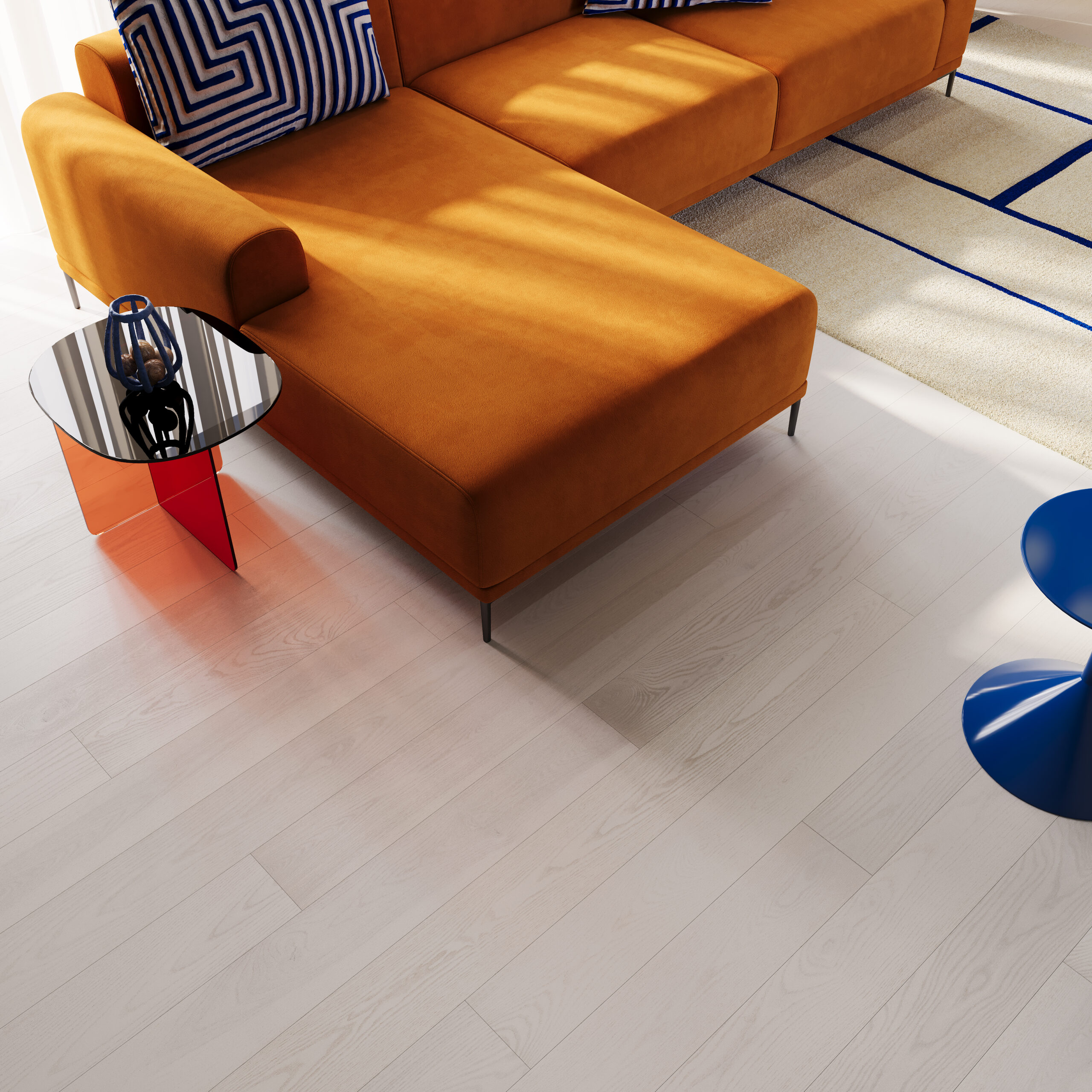 1-sávos padló hideg árnyalatú citromsorbettel. Modern és merész forma, fehér, matt lakkal bevonva. Az éleket finom mikrobevágás emeli ki, amely optikailag meghosszabbítja a padló alakját. A természetes fa szerkezete a csiszolási folyamat során láthatóvá válik, a természetes fa jellemzőinek mérsékelt skálája pedig dekoratív hatást kölcsönöz a padlónak.