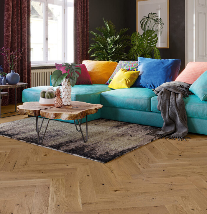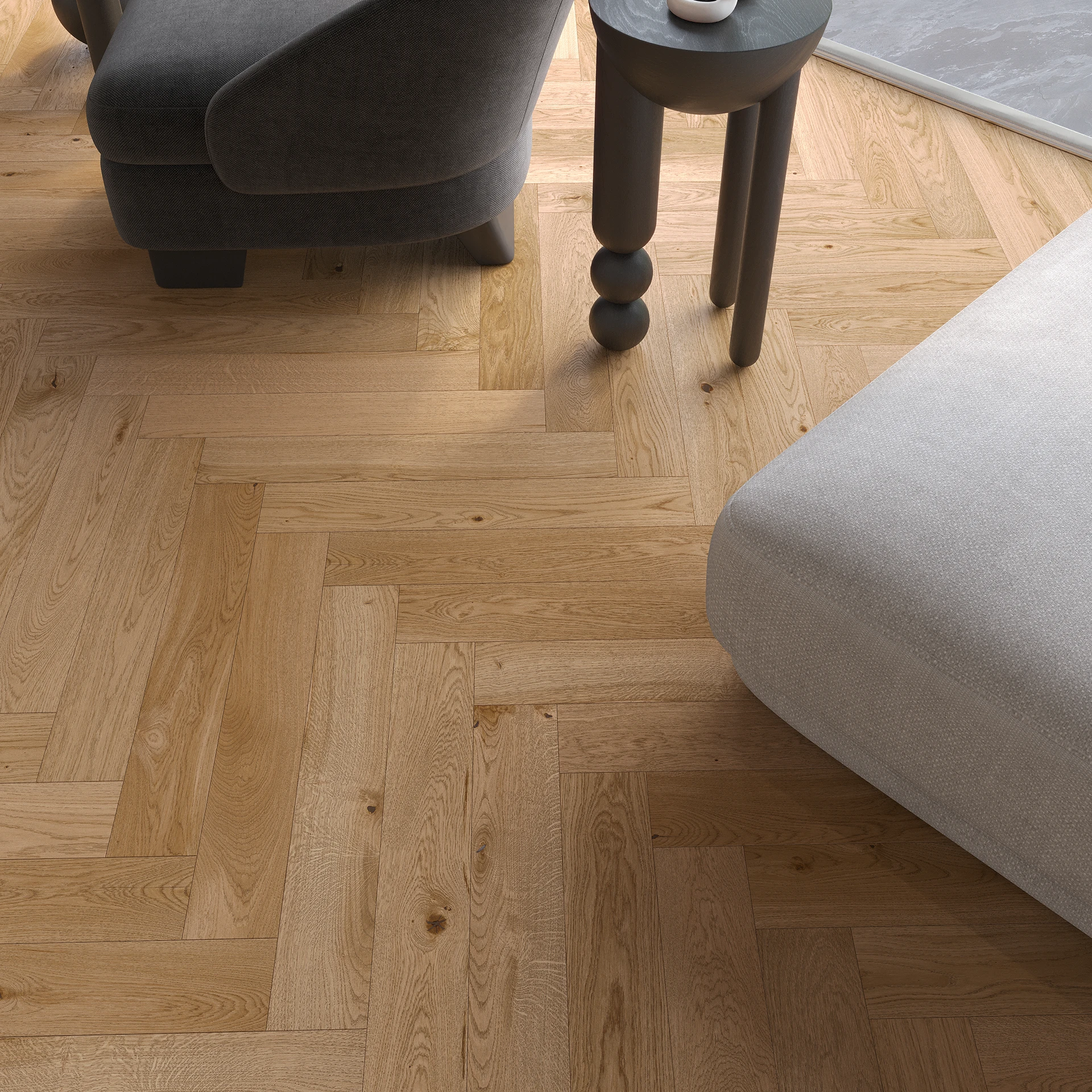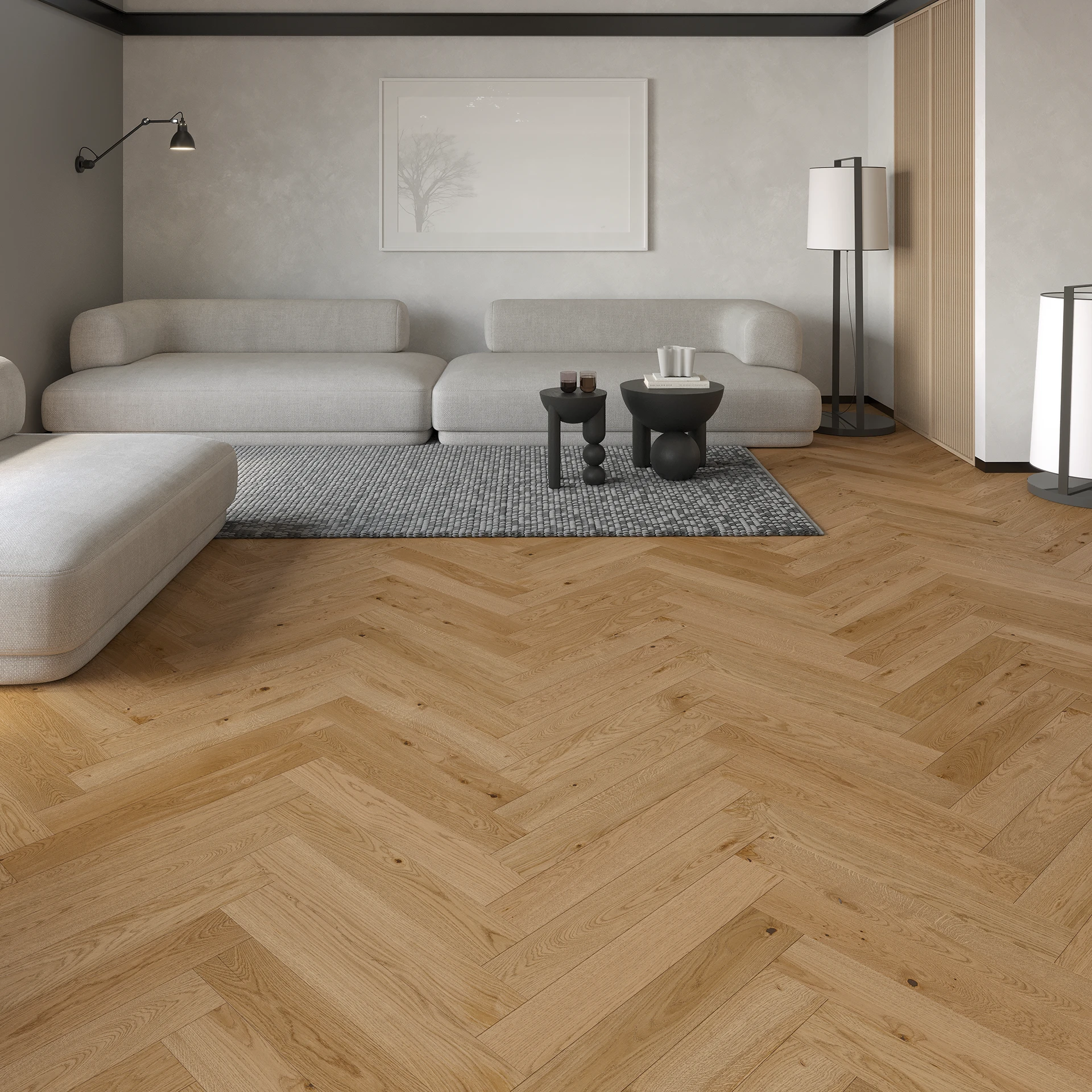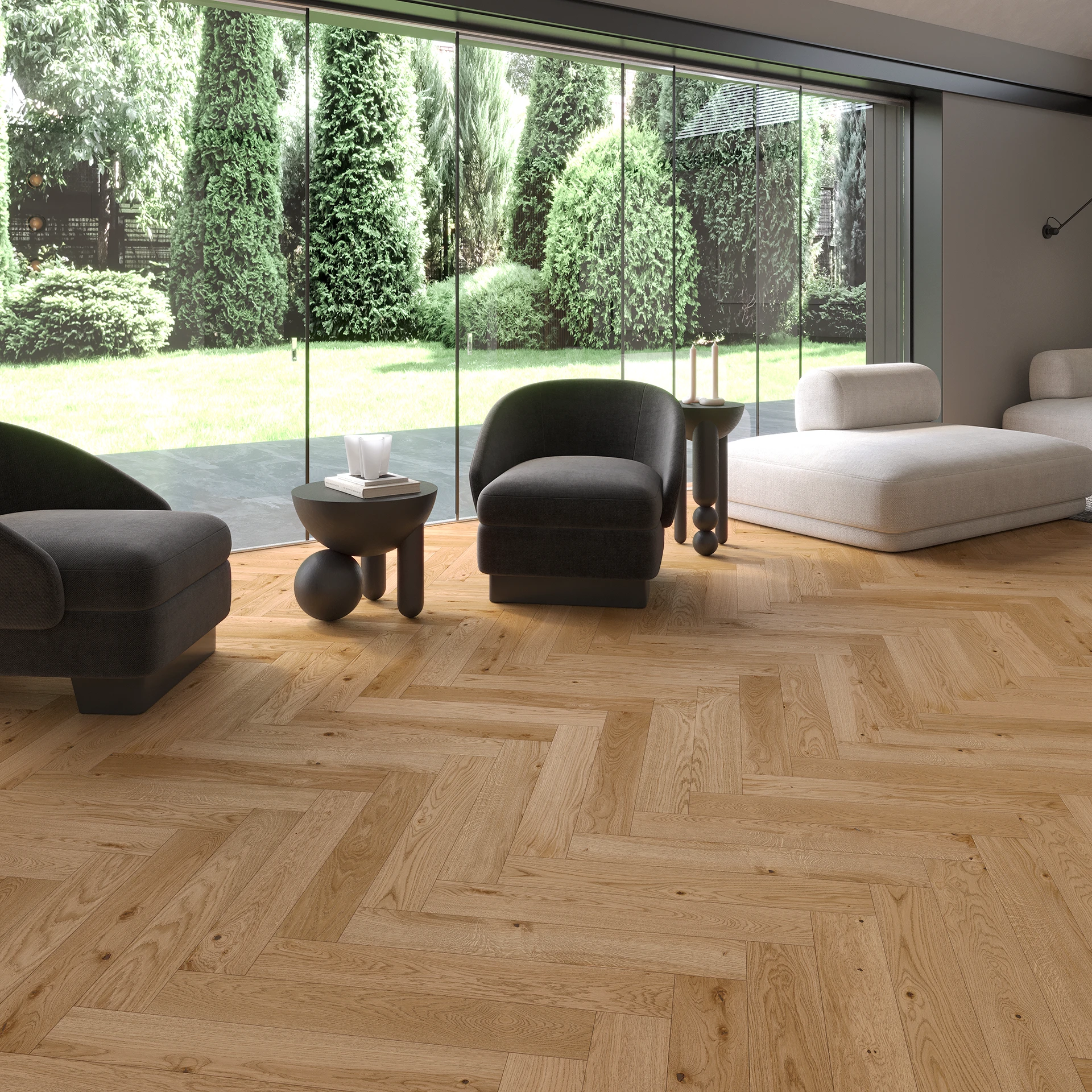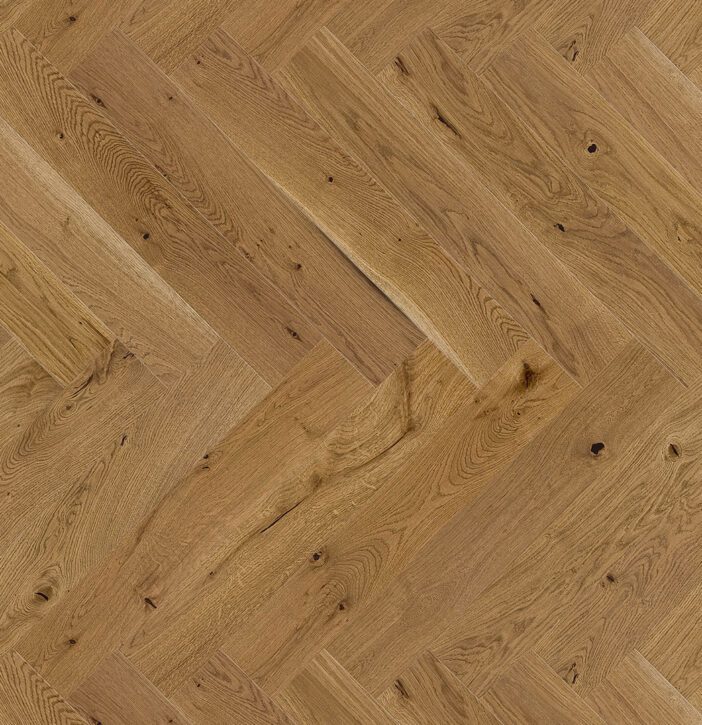 Melegbarna színű tölgyfa padló, erősen hangsúlyos fa jellemzőkkel. A szálas mintázatot a csiszolás hangsúlyozza, melyben a négyoldali mikro-levágás még jobban kiemeli a padló karakterét. Matt lakkal van bevonva.