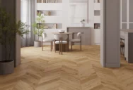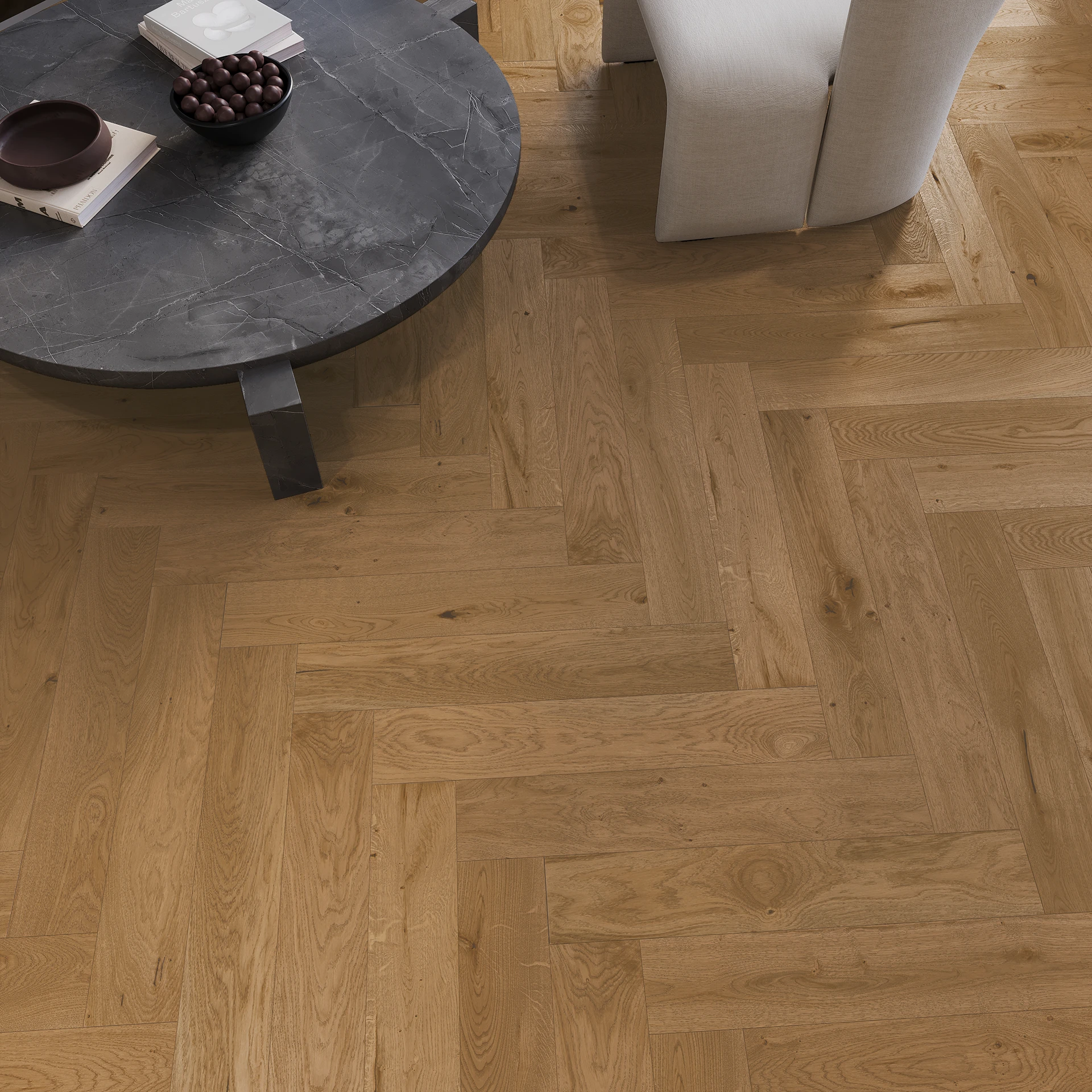 Tölgyfa padló karakteres fa jellemzőkkel és kellemes melegbarna árnyalattal. A padló szálcsiszolt és sarkított az oldalain.