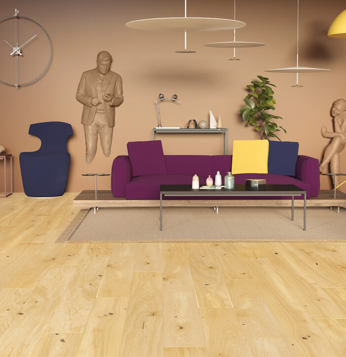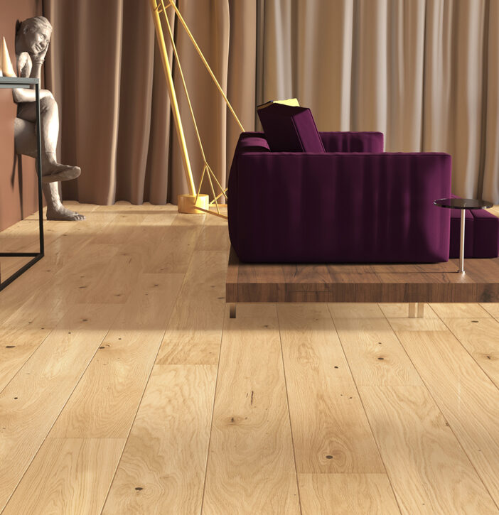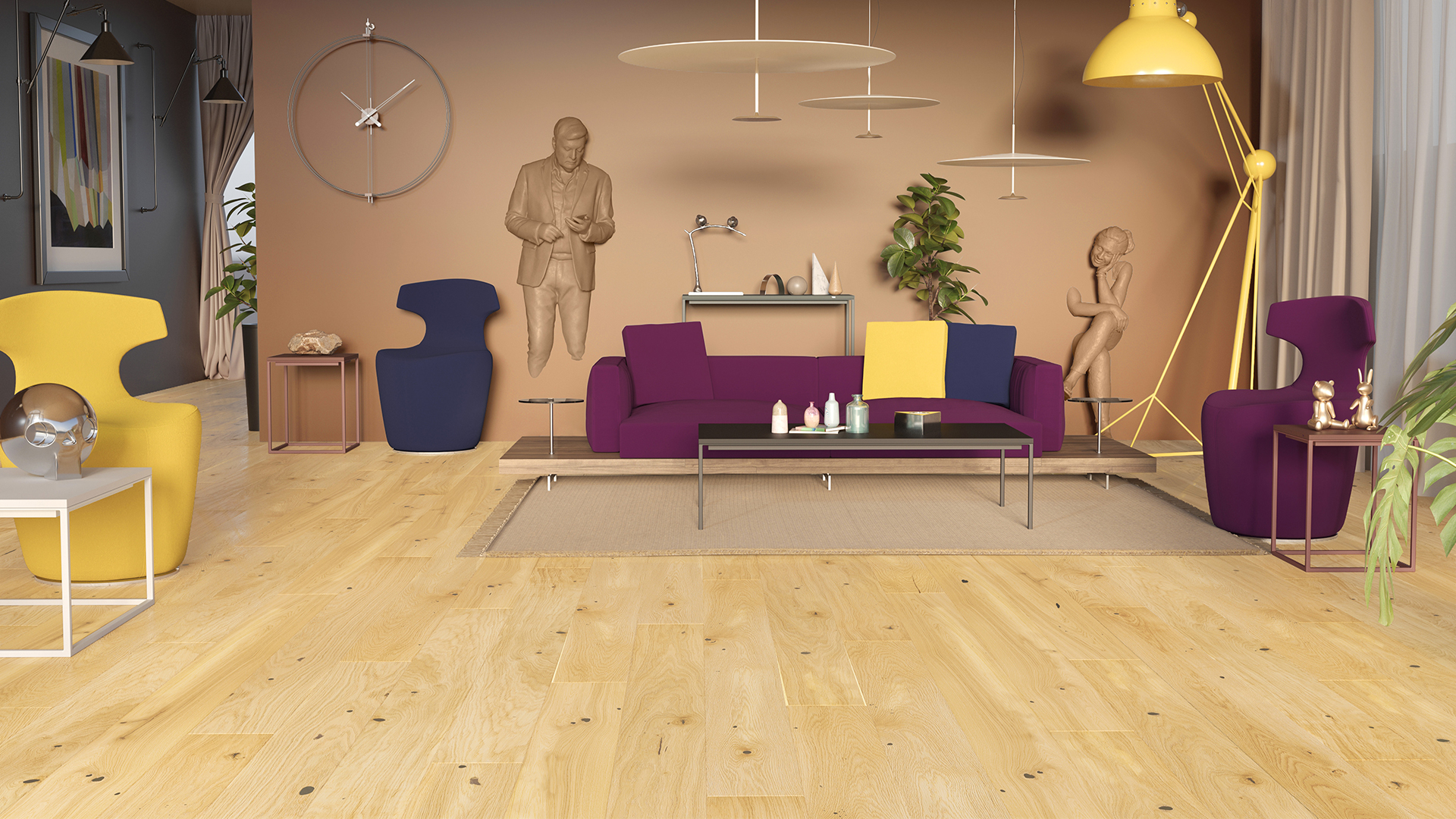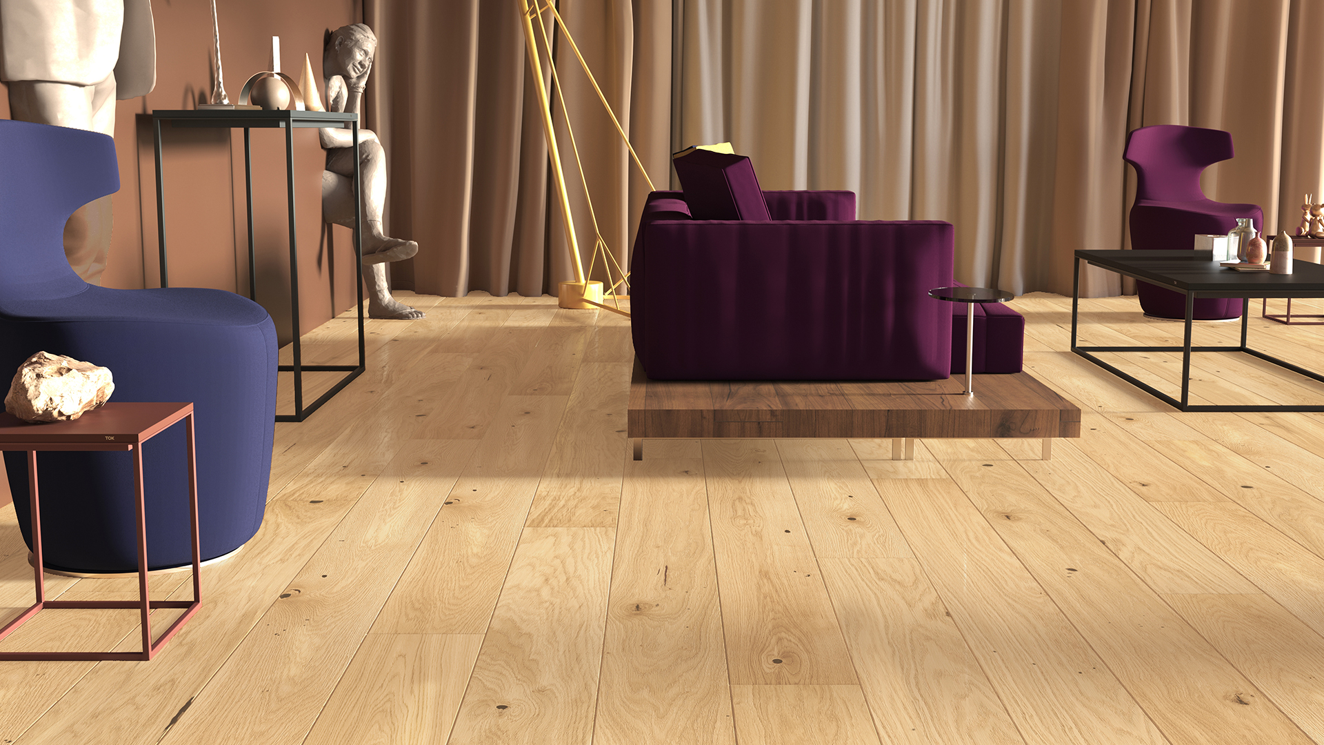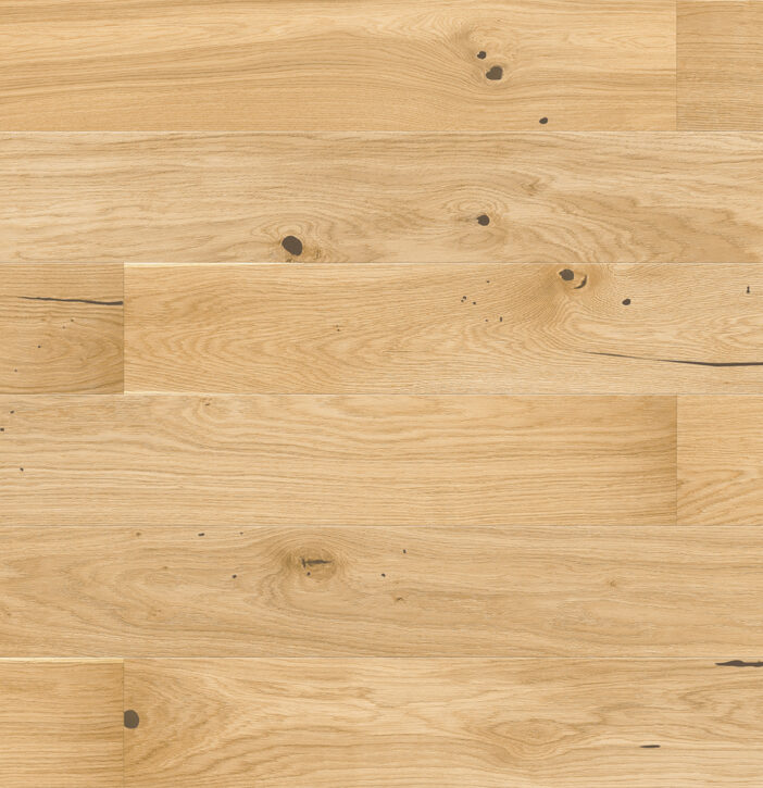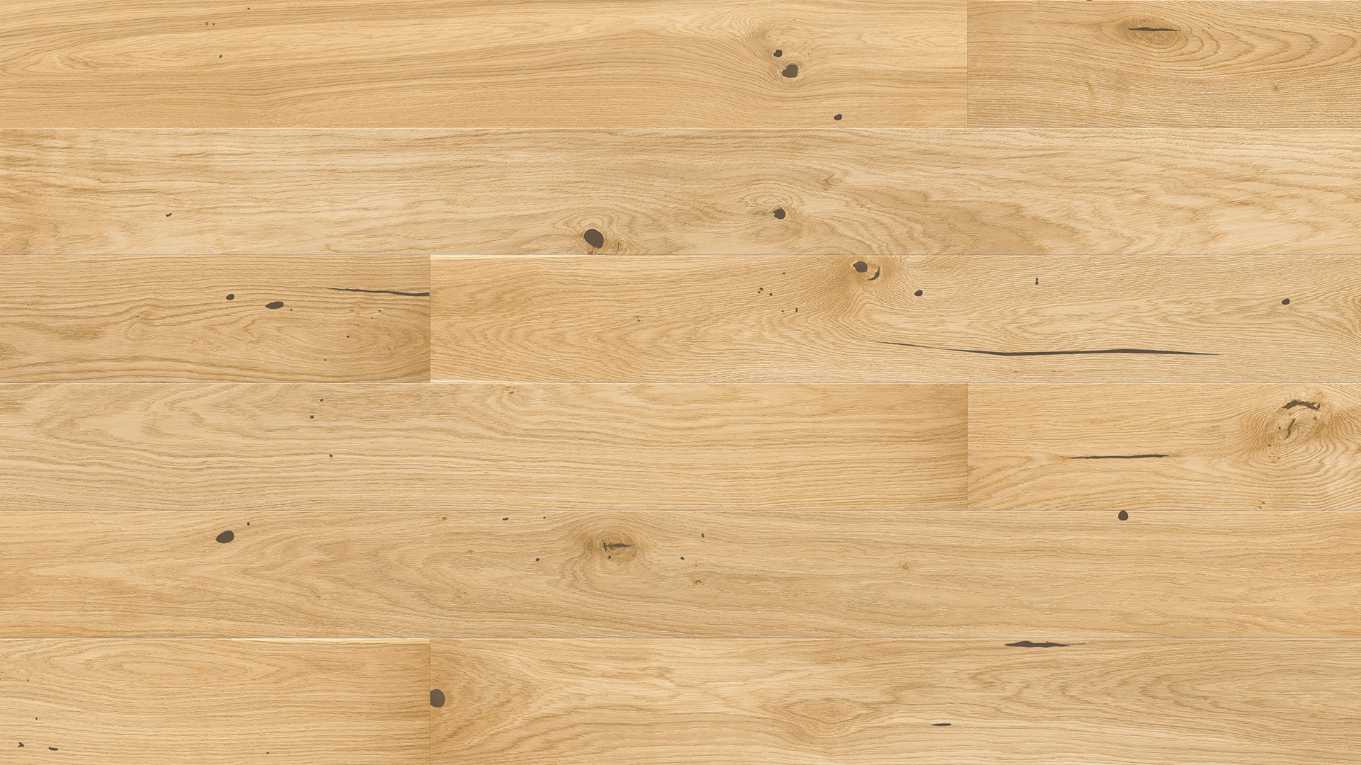 A sima tölgyfa padló egyedülálló kezelésének köszönhetően a nyers fa gyönyörű benyomását kelti. Természetes tulajdonságait a szálcsiszolás hangsúlyozza ki még jobban. Ez a padló tökéletes a hétköznapi és környezetbarát belső terekhez egyaránt. Természetes olajjal van bevonva.