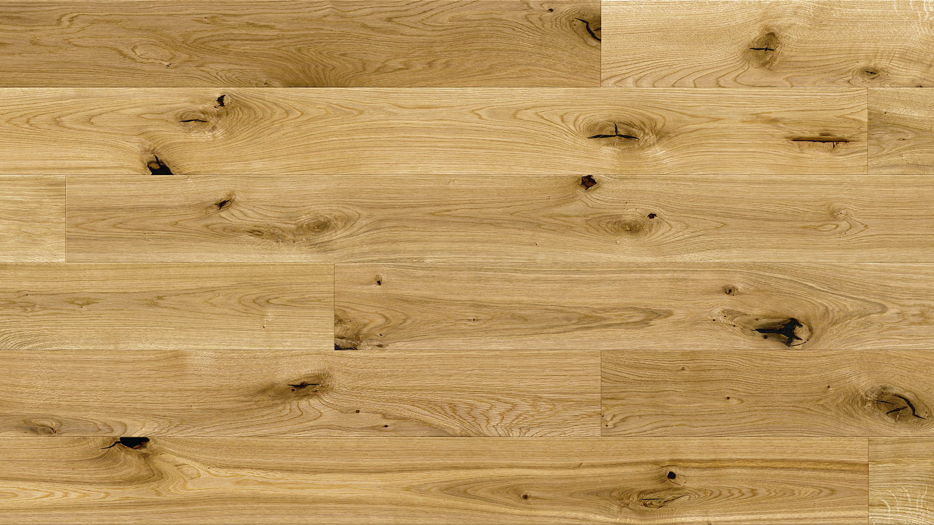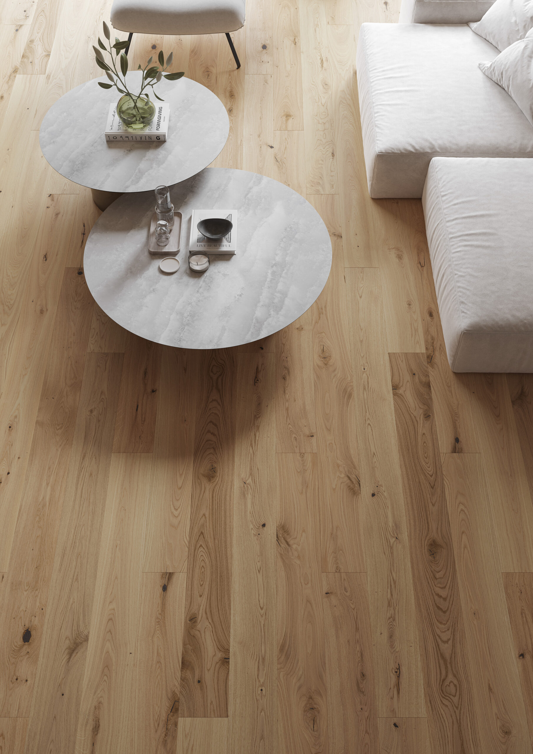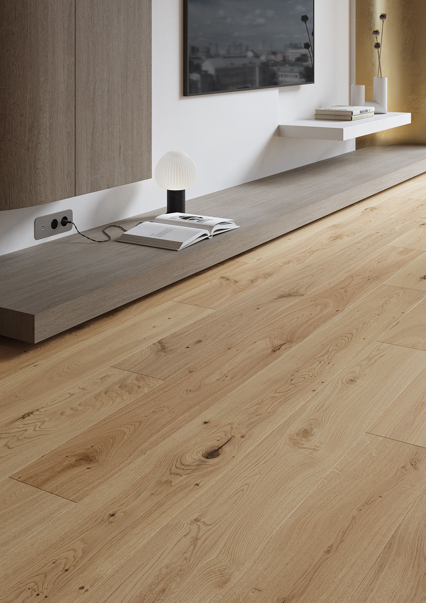 A Raisins Grande padlót a tölgyfa nagyon véletlenszerű erezetmintája és színvilága jellemzi. A négyoldalas bevágás vizuálisan meghosszabbítja a táblát, míg a csiszolás kiemeli annak természetes karakterét. A padló matt lakkal van bevonva.