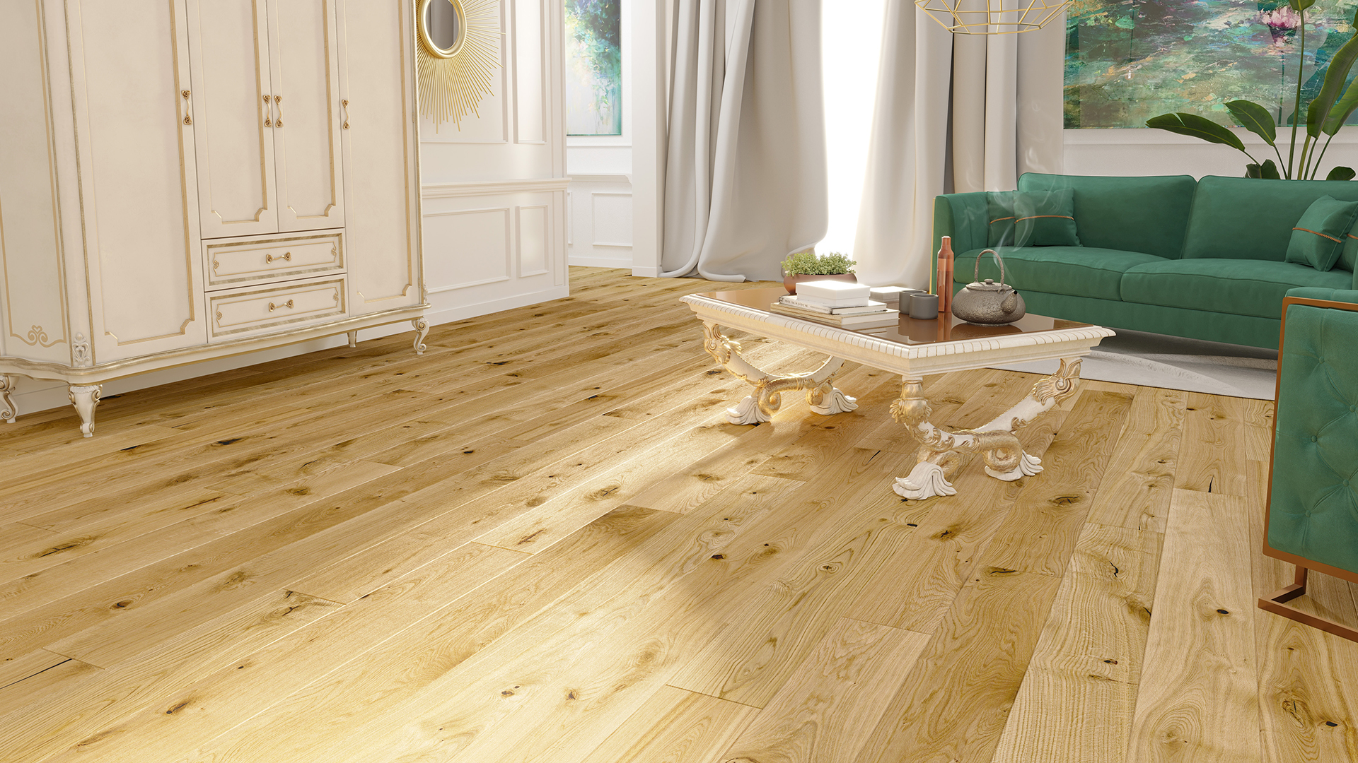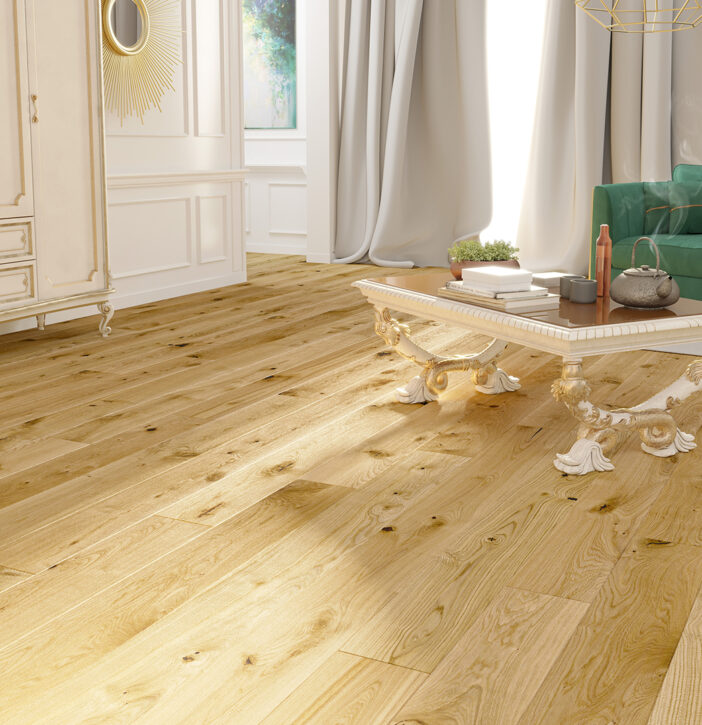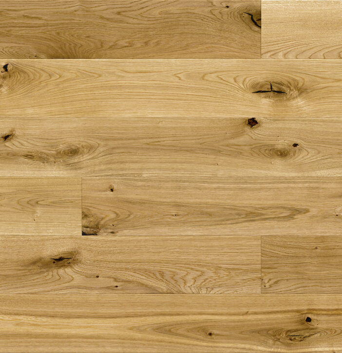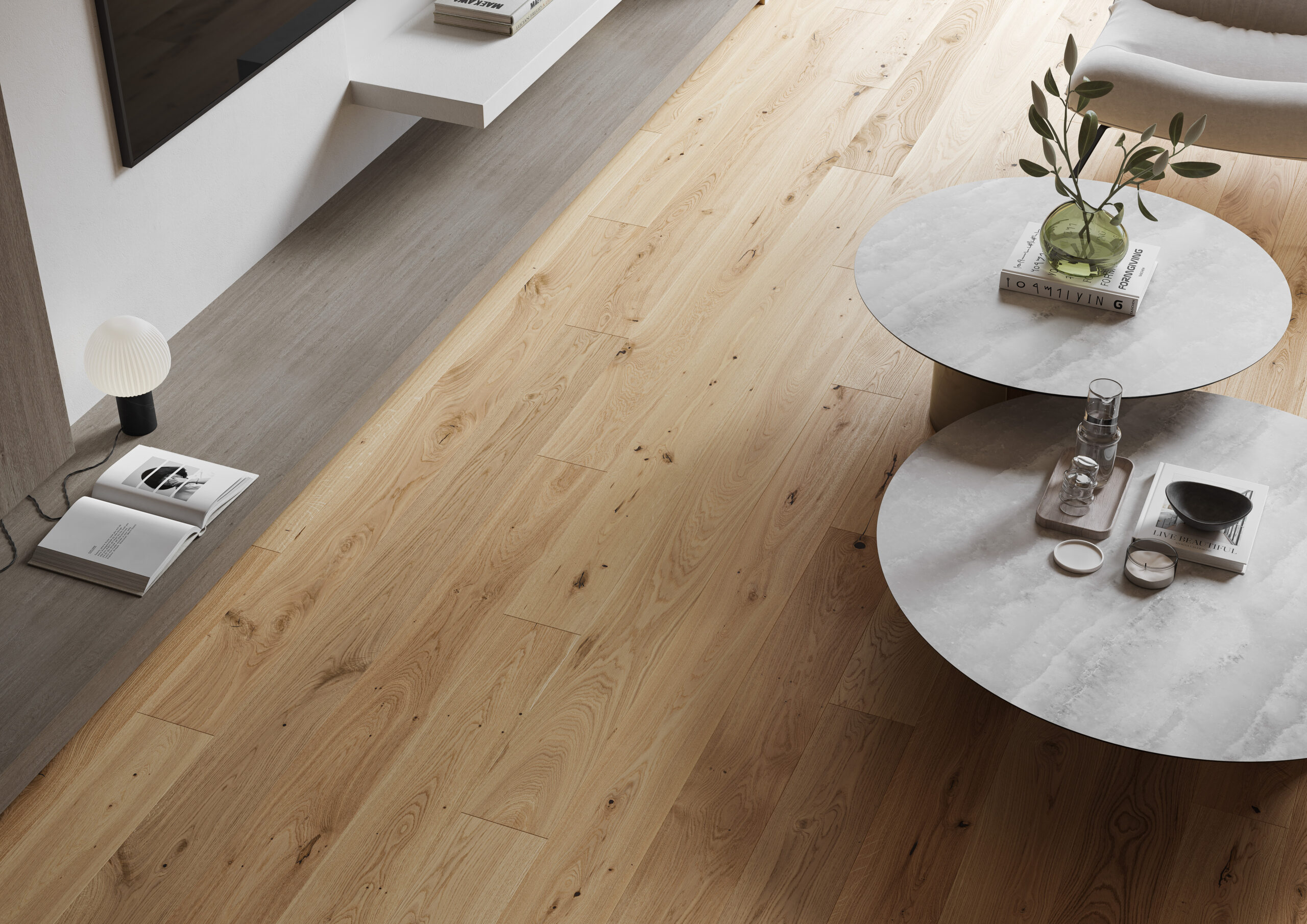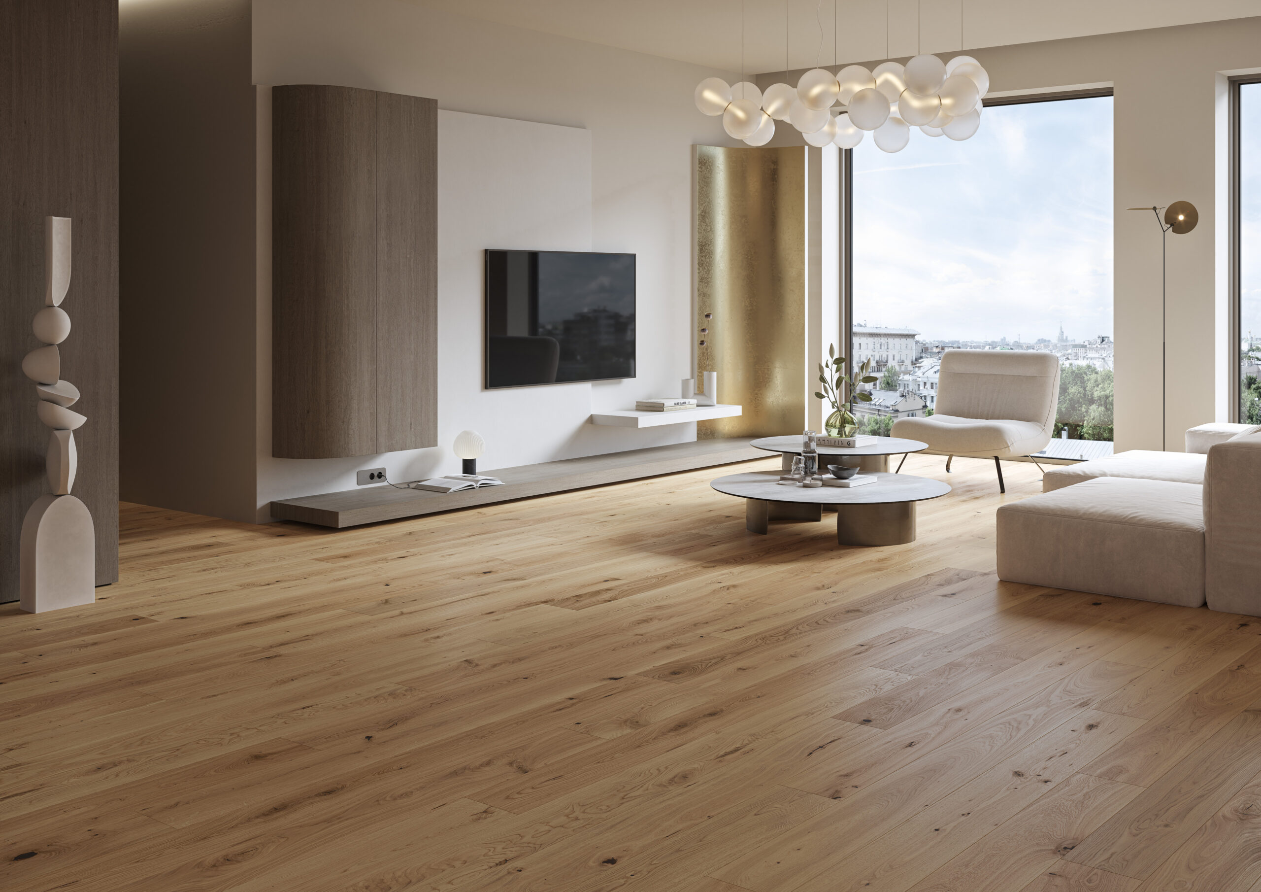 A Raisins Grande padlót a tölgyfa nagyon véletlenszerű erezetmintája és színvilága jellemzi. A négyoldalas bevágás vizuálisan meghosszabbítja a táblát, míg a csiszolás kiemeli annak természetes karakterét. A padló matt lakkal van bevonva.