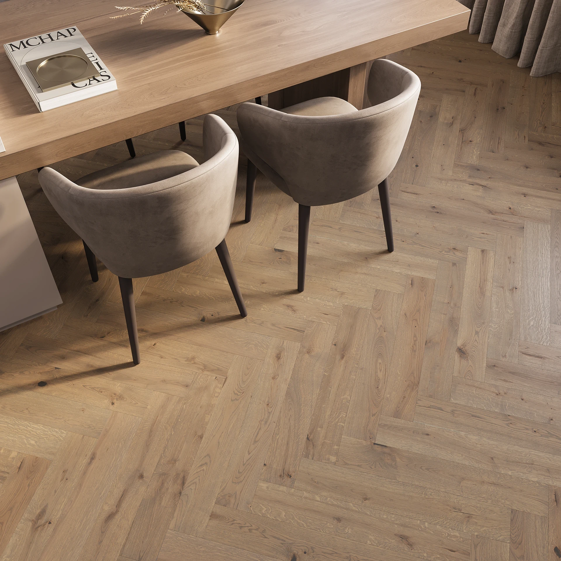 Bézs árnyalatú kőris padló, természetes fa jellemzők teljes választékával. A fa mintázatát festéssel hangsúlyozzák ki, a négyoldali mikro-bevágás pedig előkelő megjelenést kölcsönöz neki. Matt lakkal van bevonva.