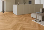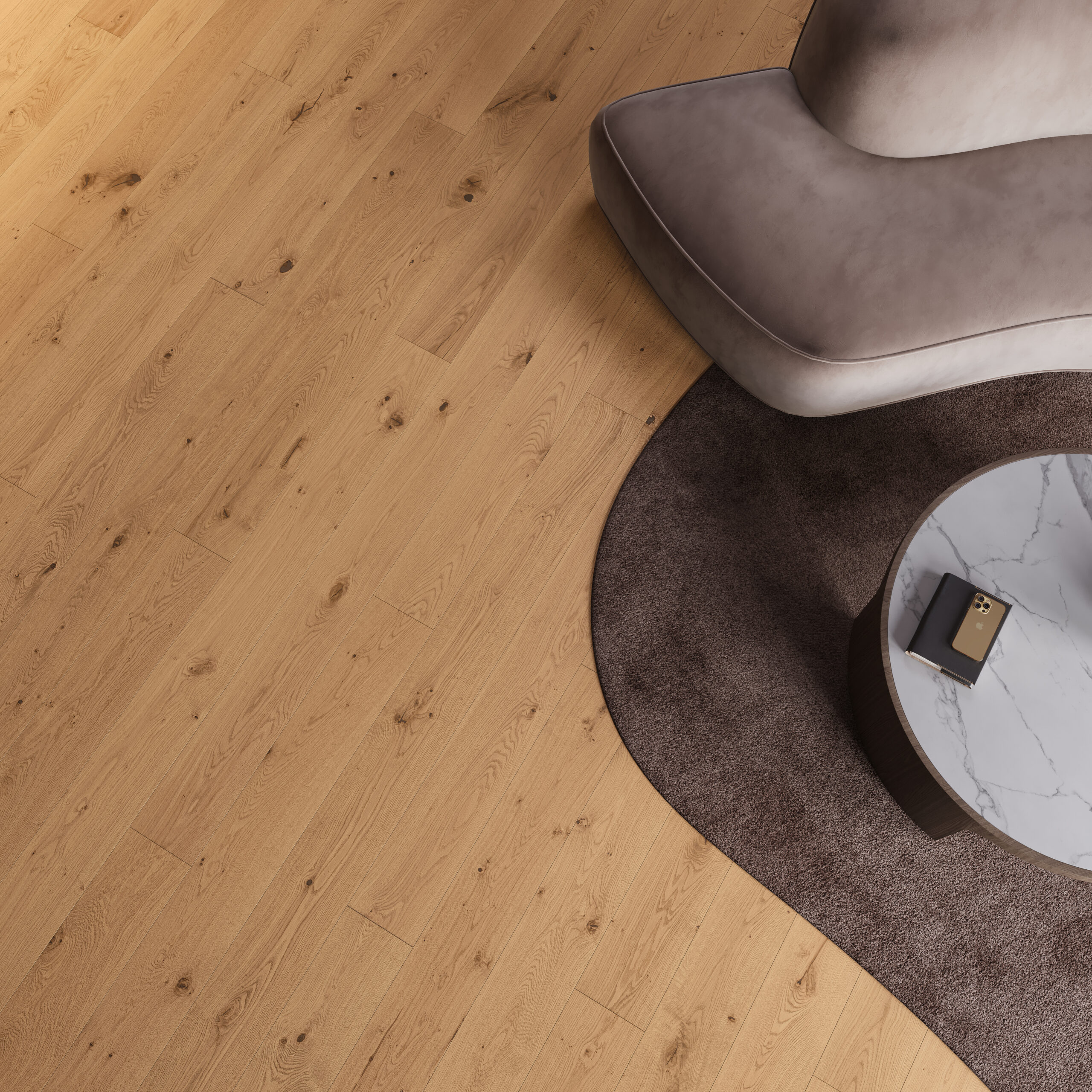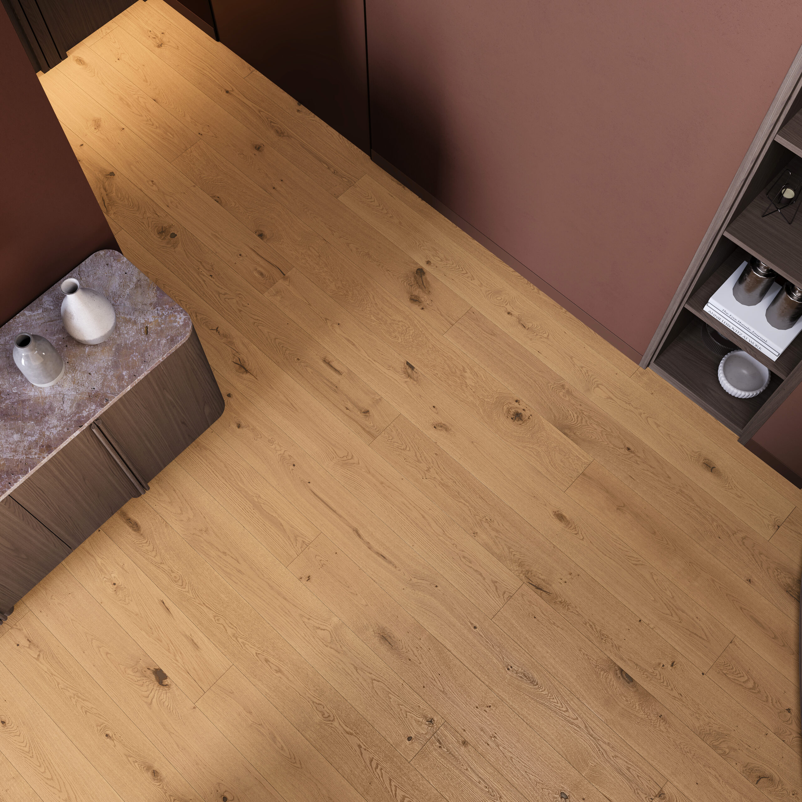 1-sávos tölgyfa padló arany és meleg barna árnyalataival. A natúr olajjal bevont padlók karcsúságát 4 oldali ferde levágással érték el. A csiszolási folyamat során hangsúlyt kapott a fa egyedisége és gazdagsága.