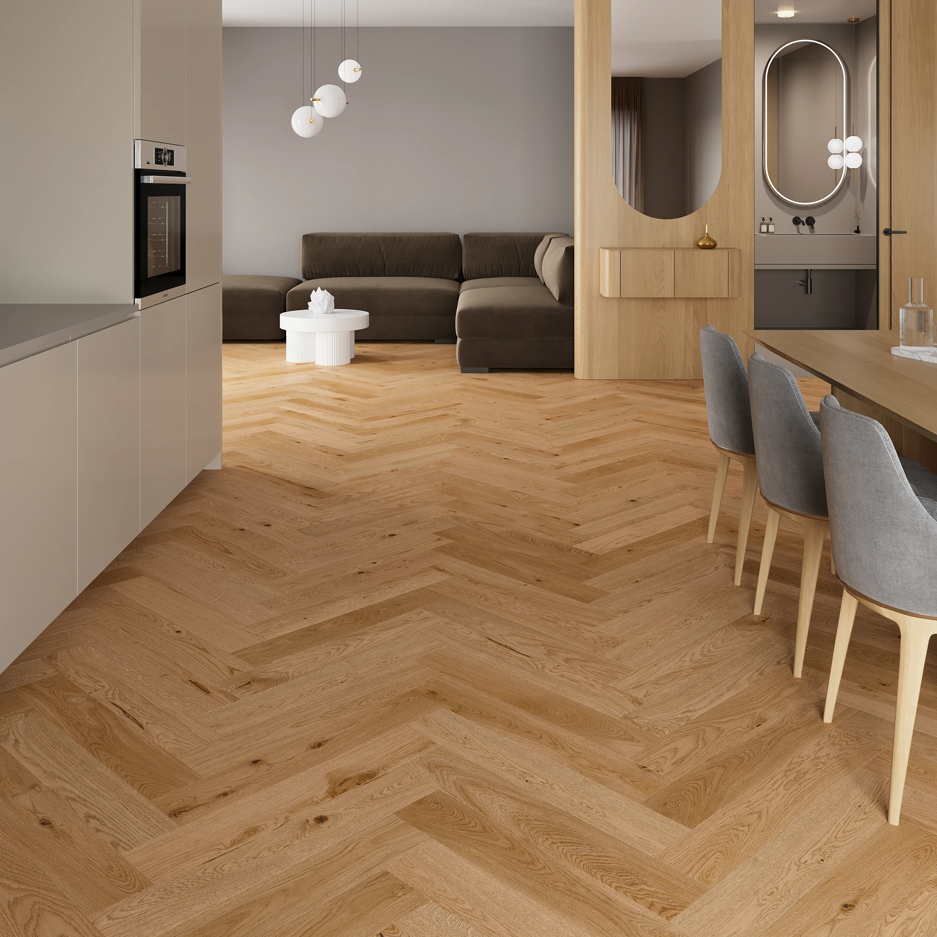 1-sávos tölgyfa padló az arany és a meleg barna tónusaiban. Az olajjal bevont natúr padlók vékonyságát 4 oldali levágással érik el. A fa egyedisége és gazdagsága a csiszolási folyamat során kiemelésre kerül.