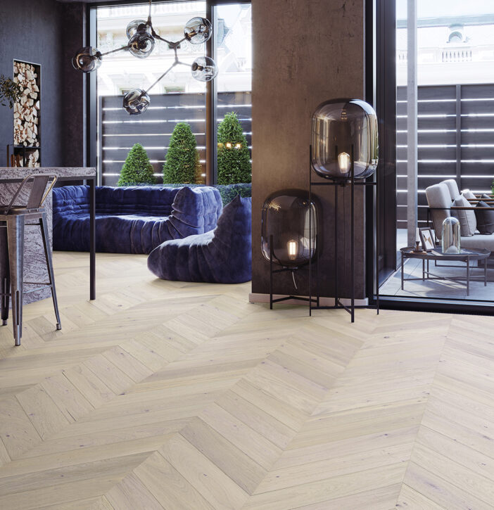 Klasszikus tölgyfa padló, finoman lágyított gyöngyházfehér árnyalattal. A padló finom természetes tulajdonságokkal bír, amit a csiszolási folyamat még jobban kihangsúlyoz. A padló karcsúságát és könnyedségét a 4 oldalú mikro-bevágással érik el Matt lakkozással készült.