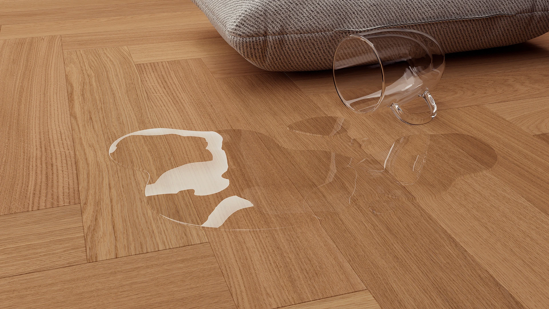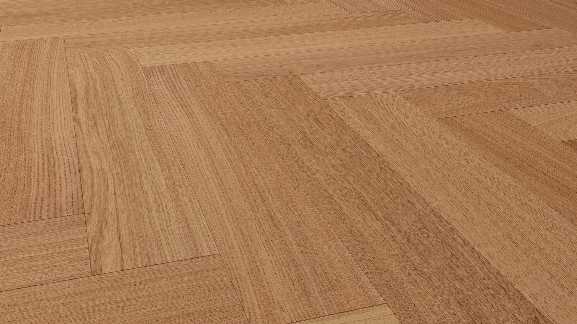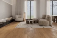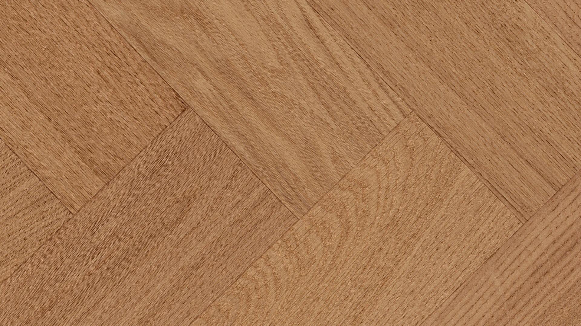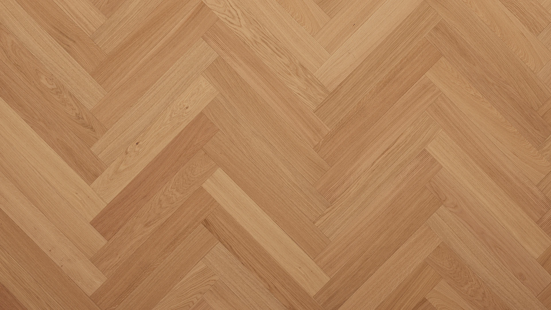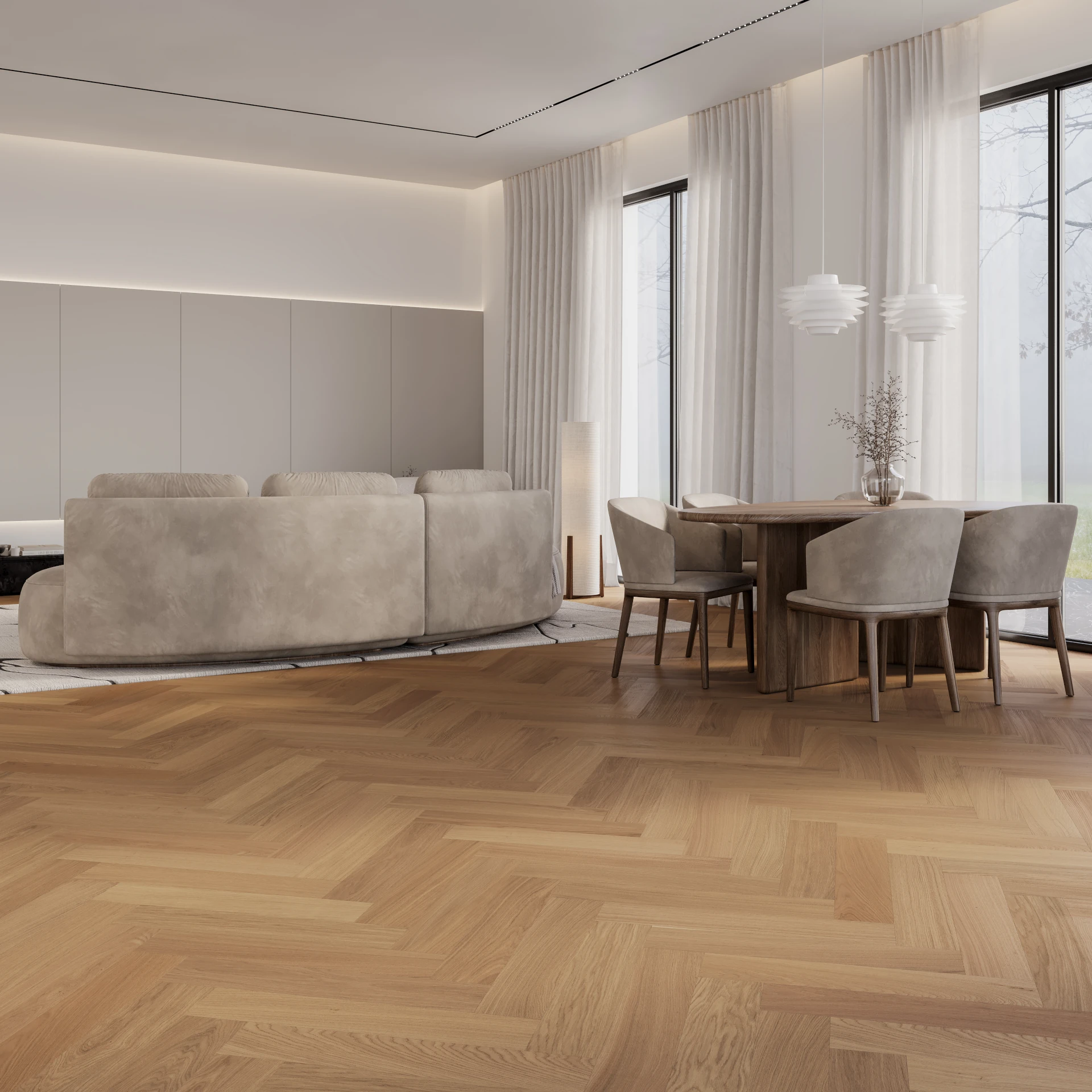 A klasszikus halszálkás tölgyfa padló finom, krémes árnyalatban melegséget és harmóniát visz a belső térbe. A világos fa megvilágítja a teret, a kefélt textúra pedig kiemeli a természetes erezetet.