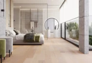 Naturalna dębowa podłoga z delikatnie podkreślonymi cechami drewna. Szczotkowana powierzchnia pięknie uwydatnia rysunek słojów, nadając podłodze autentyczny charakter i szlachetny wygląd.